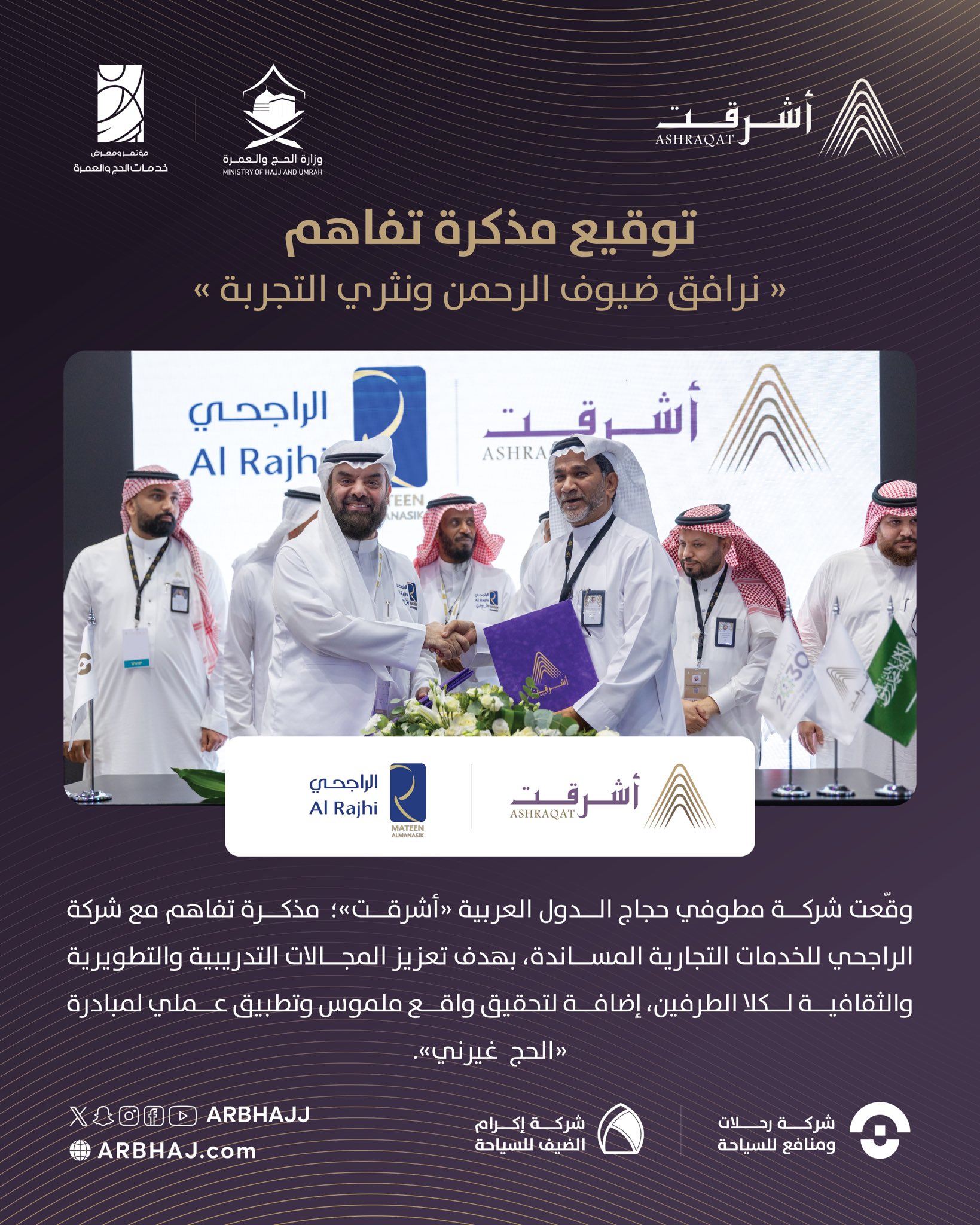 تعزيزًا للمجالات التدريبية والتطويرية والثقافية؛ وقّعنا في شركة مطوّفي حجاج الدول العربية “أشرقت”؛ مذكرة تفاهمٍ مع شركة الراجحي للخدمات التجارية المساندة، لتحقيق إضافة تطويرية وإثراء متكامل يجسد ويعكس أثر مبادرة “الحج غيرني”