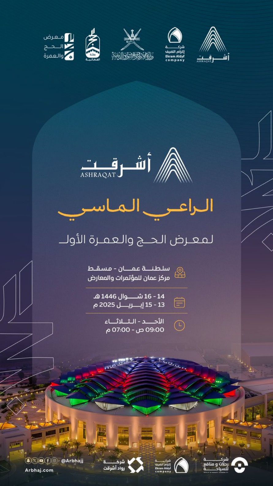 اركت شركة مطوفي حجاج الدول العربية (أشرقت) وجناحها شركة إكرام الضيف في معرض الحج والعمرة الأول في سلطنة عمان لعام 1446هـ خلال الفترة من 13 إلى 15 أبريل الجاري في أول مشاركة خارجية لـ أشرقت في معرض خارجي خاص بالحج.
