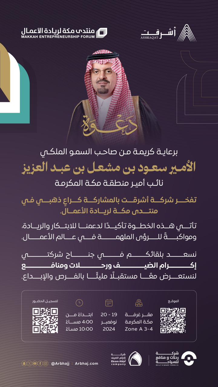 ندعوكم لحضور منتدى مكة لريادة الأعمال، ملتقى الإبداع والطموح لبناء مستقبل ريادي واعد.