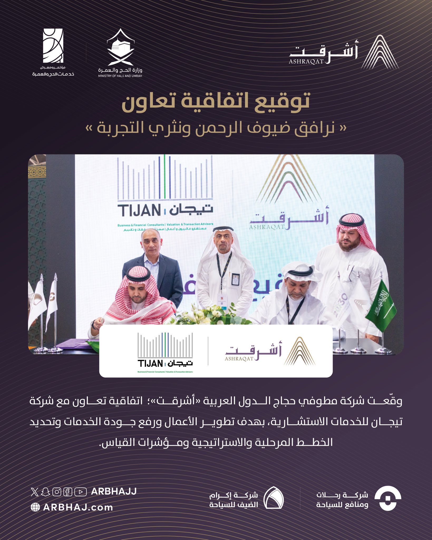 سعيًا لتطوير الأعمال ورفع كفاءة جودة الخدمات؛ وقّعنا في شركة مطوّفي حجاج الدول العربية “أشرقت”؛ اتفاقية تعاون مع شركة تيجان للخدمات الاستشارية، تهدف لتحديد الخطط المرحلية والاستراتيجية ومؤشرات القياس.