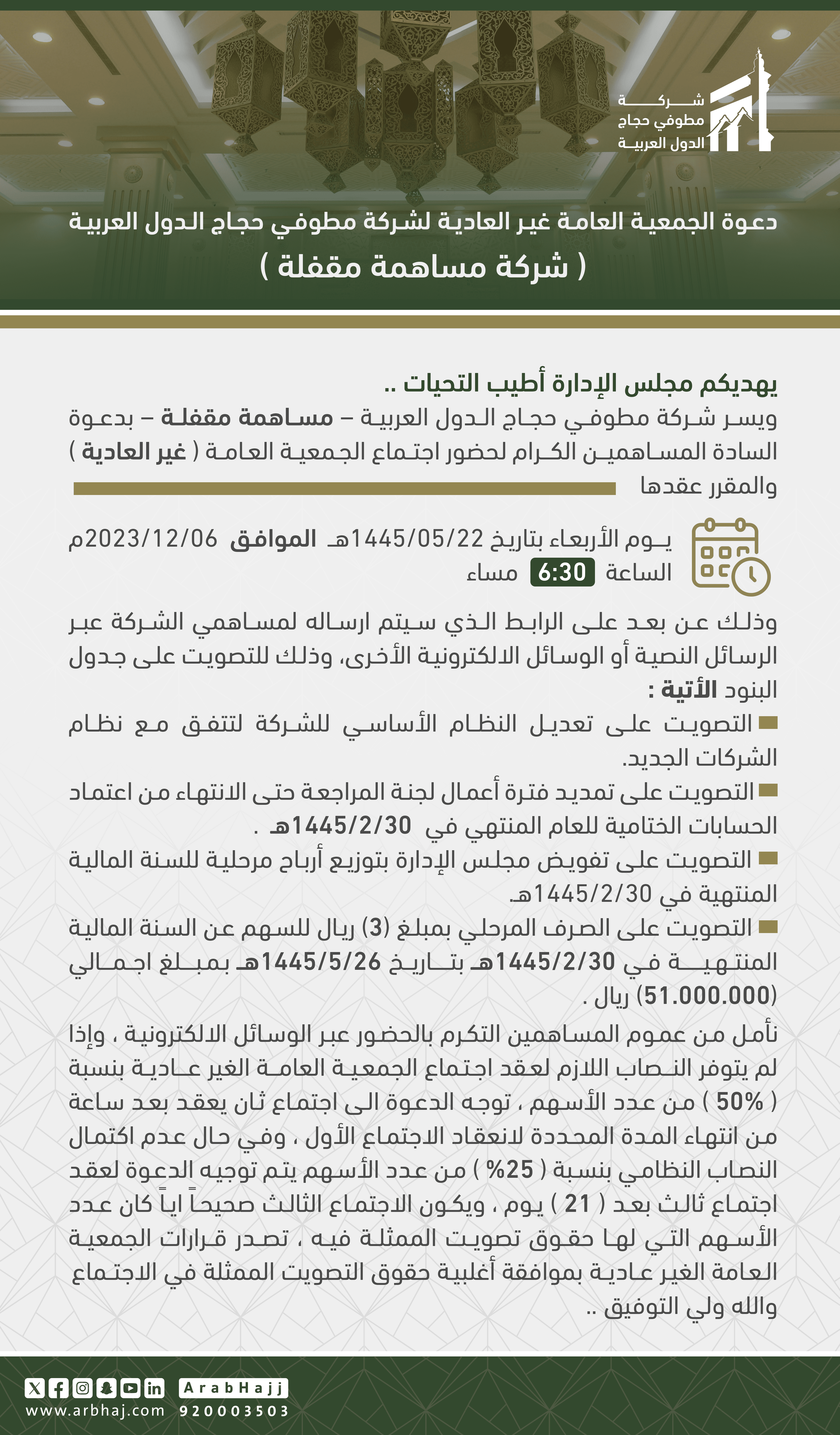 دعوة لحضور اجتماع الجمعية العامة غير العادية لشركة مطوفي حجاج الدول العربية (شركة مساهمة مقفلة)