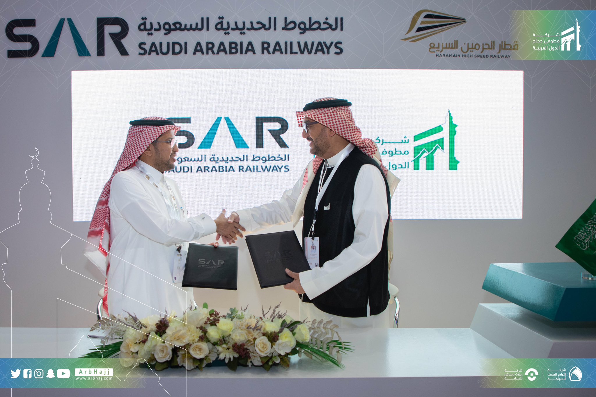 ضمن فعاليات اكسبو الحج وقعنا في شركة مطوفي حجاج الدول العربية مذكرة تفاهم مع شركة الخطوط الحديدية السعودية “سار” للتعاون في مجال نقل ضيوف الرحمن عبر قطار الحرميين السريع